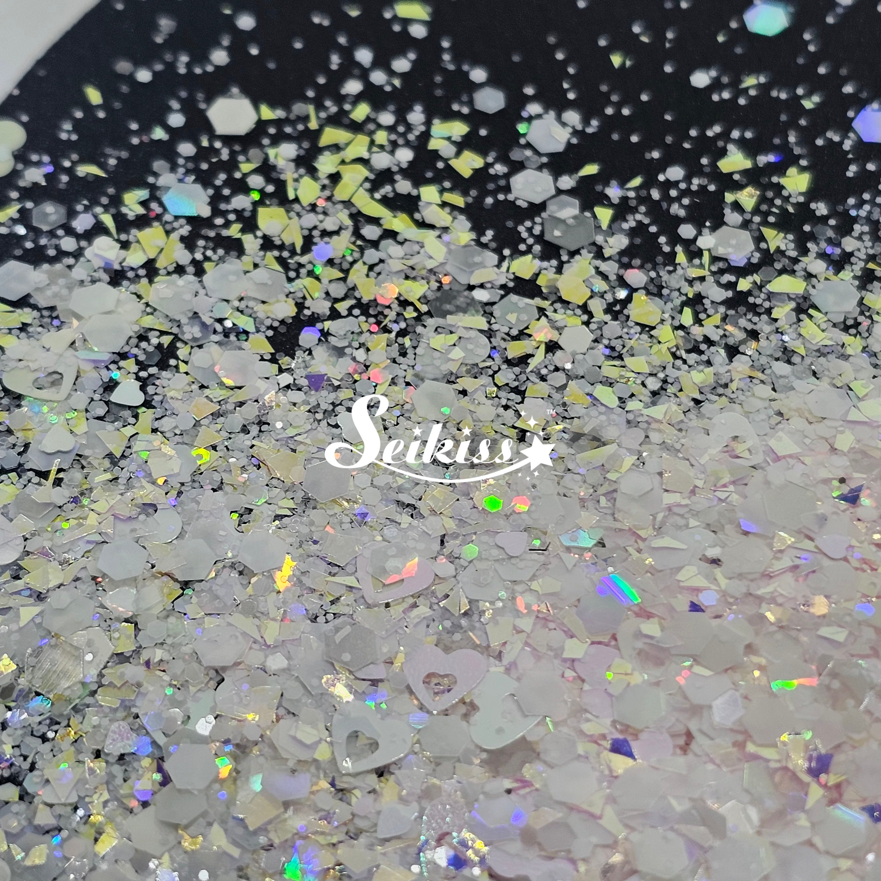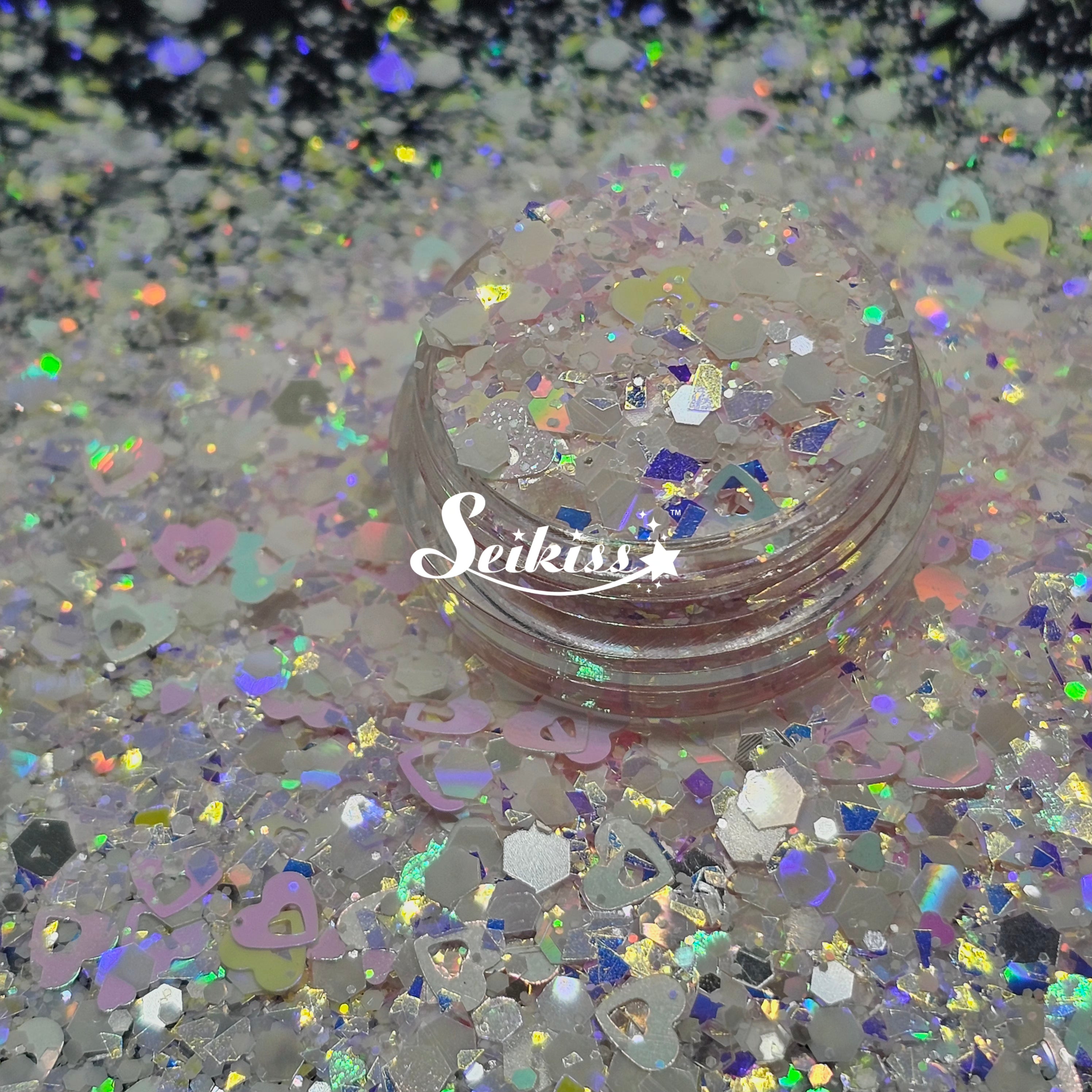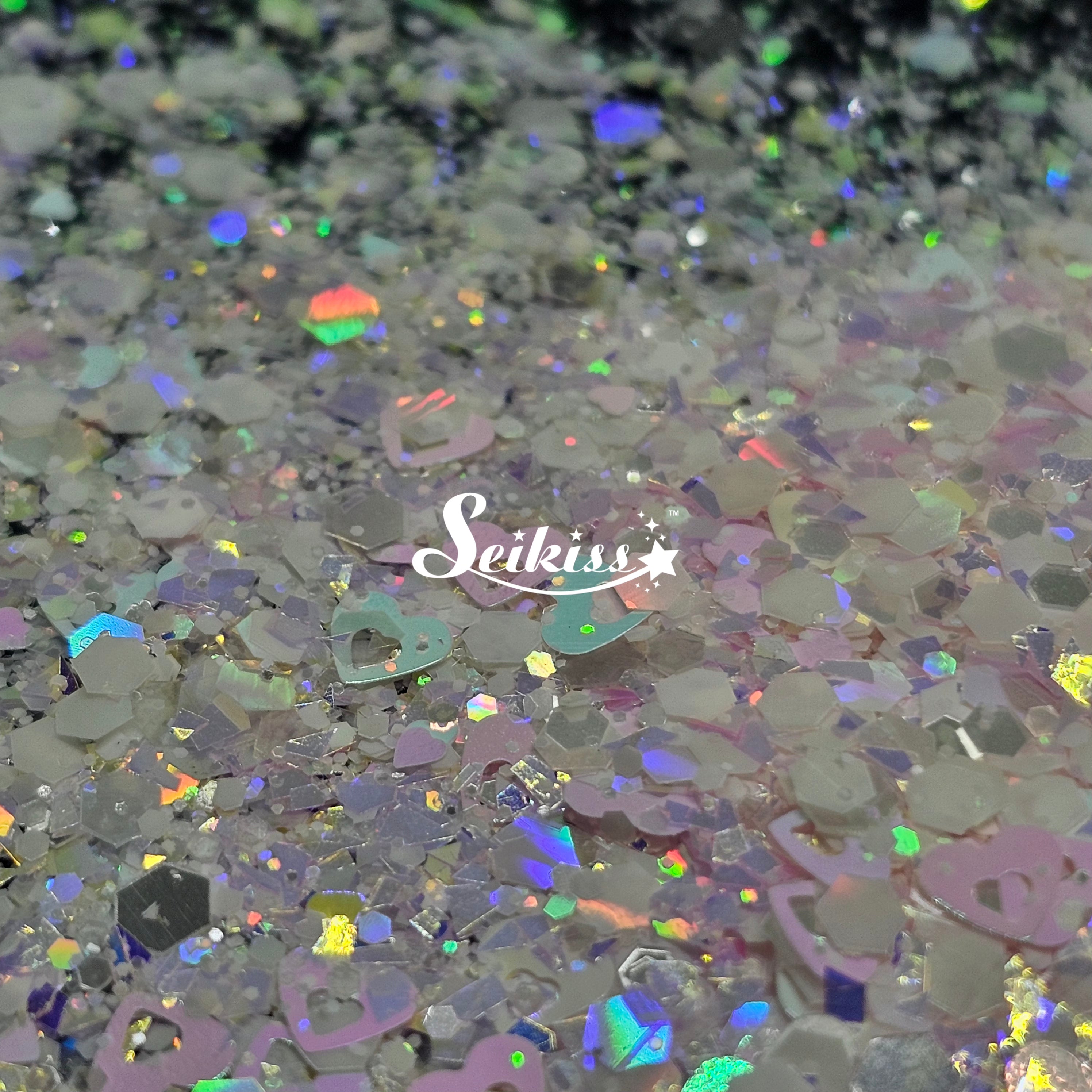 Sweetheart is a custom glitter mix with iridescent hearts, flakes and white holographic chunky mix. Perfect for resin, nails, tumblers, jewelry, arts, and all types of crafts and projects.