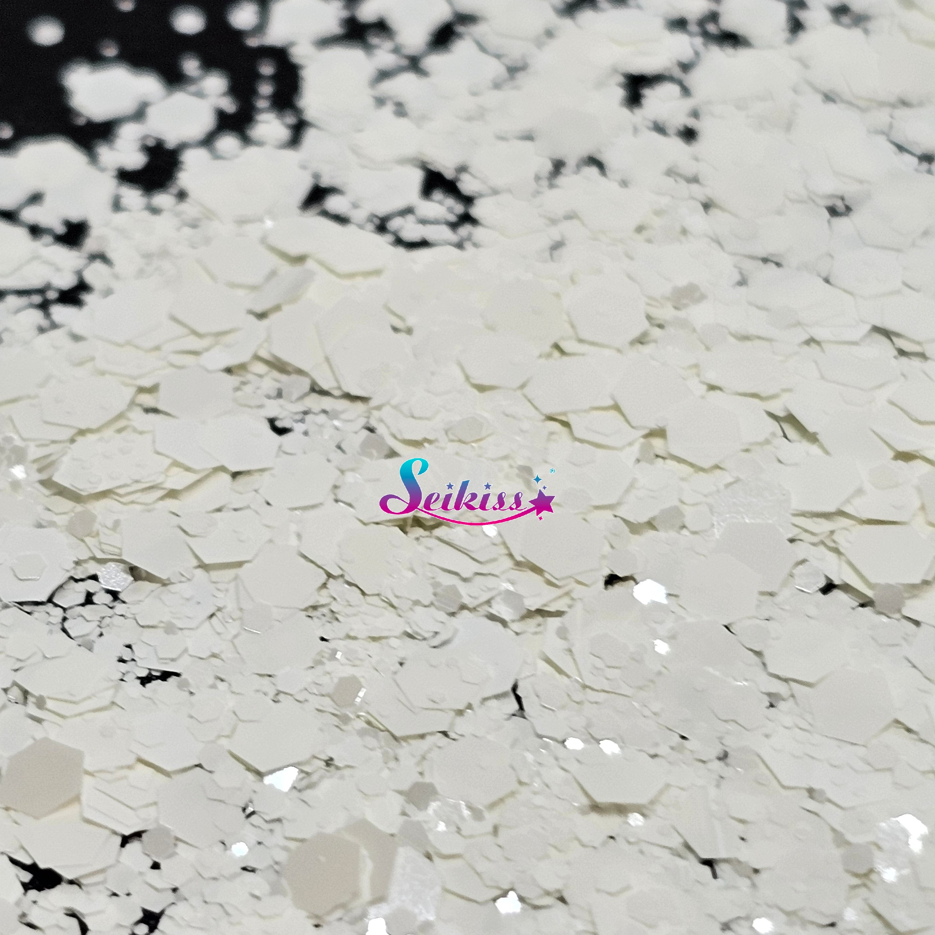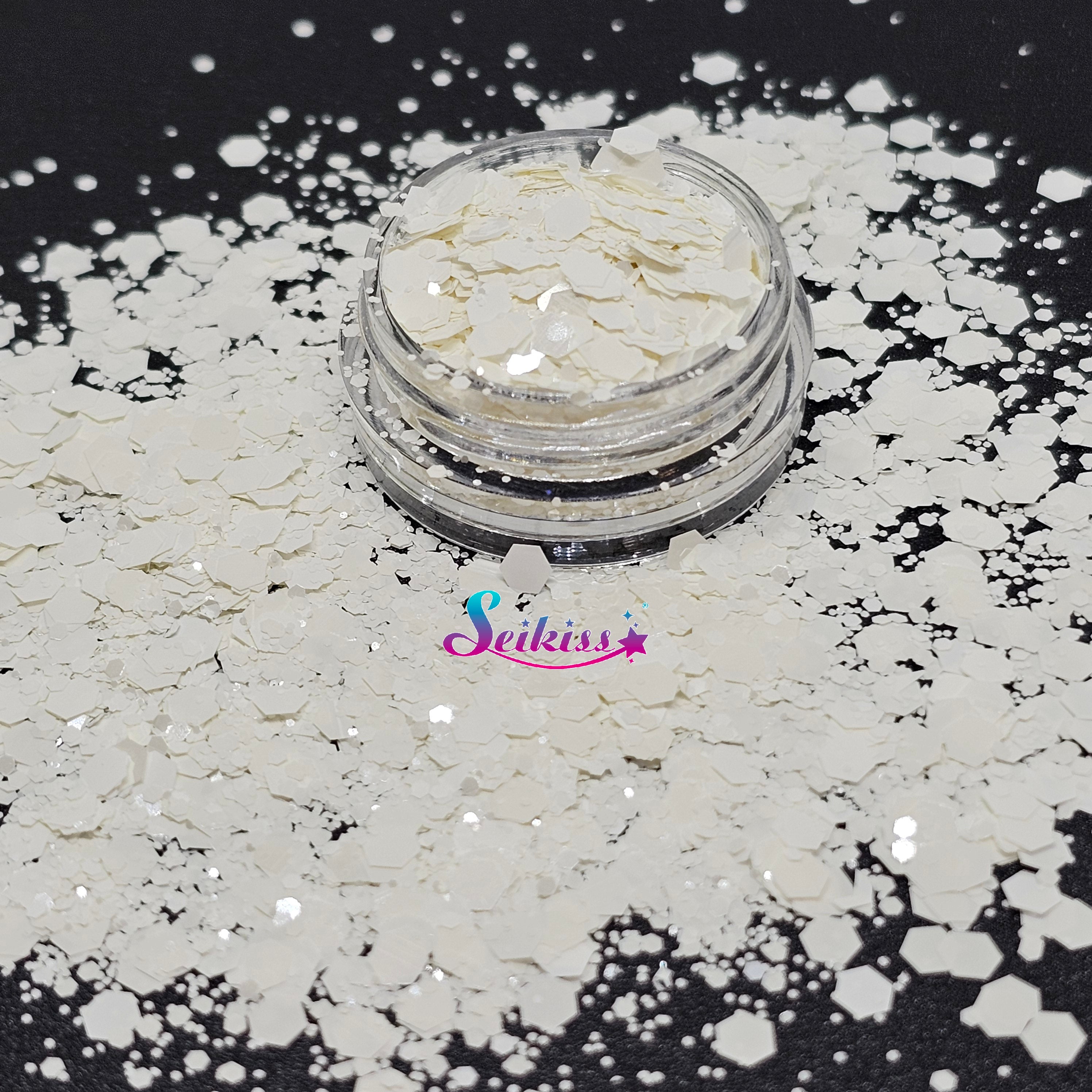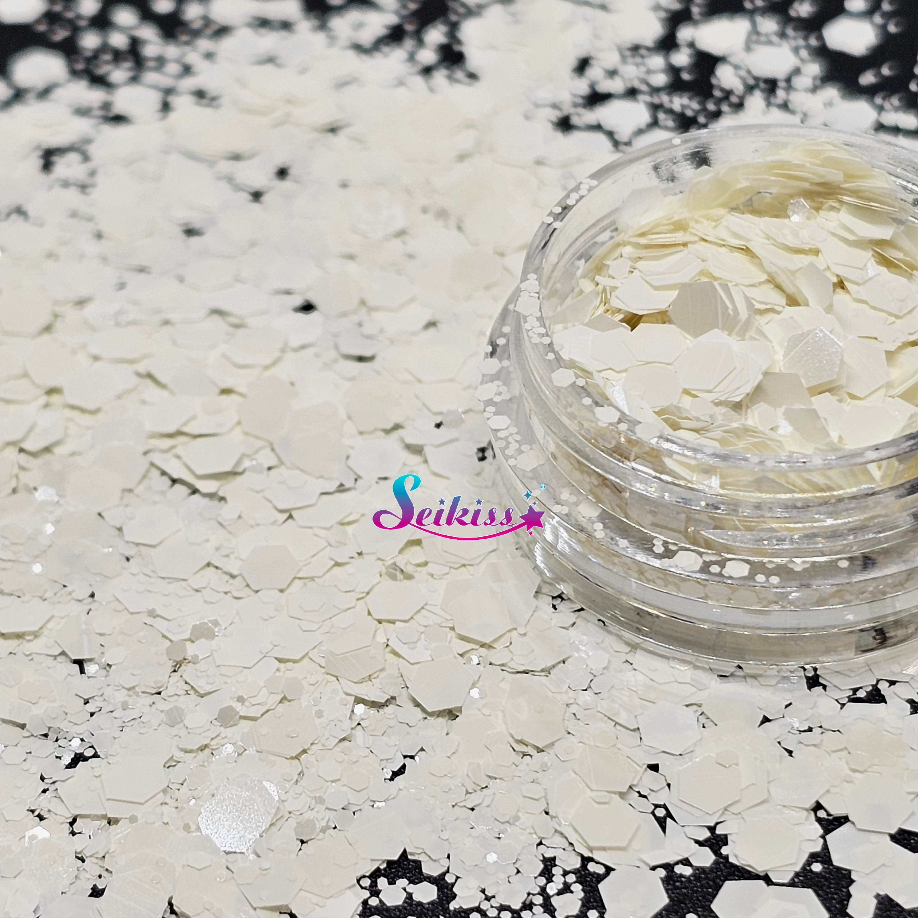 Vanilla Chunky Glitter Mix features a metallic soft (ivory) white. Perfect for mixing with other colors and use with nails, resin, tumblers, jewelry, arts, and all types of crafts and projects.