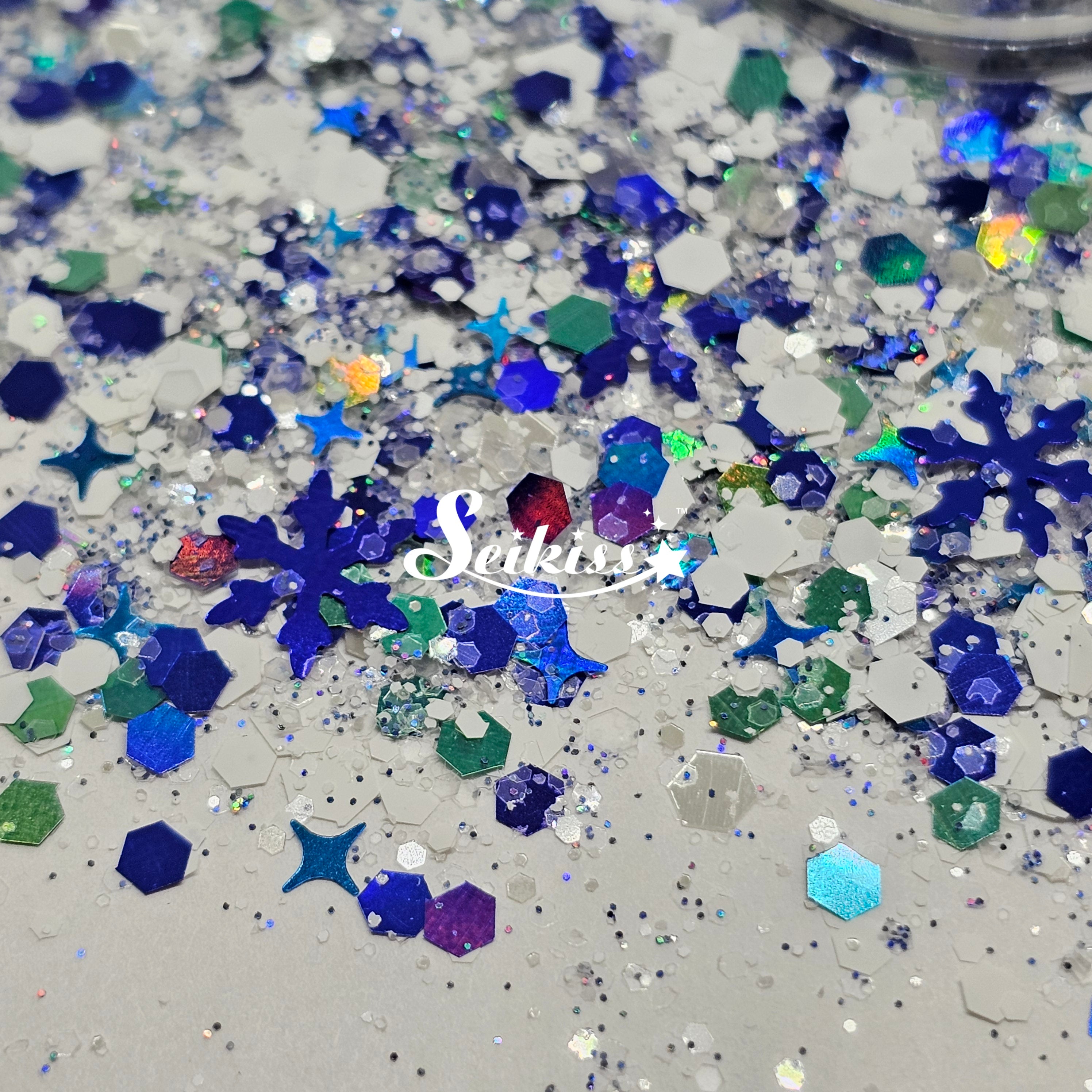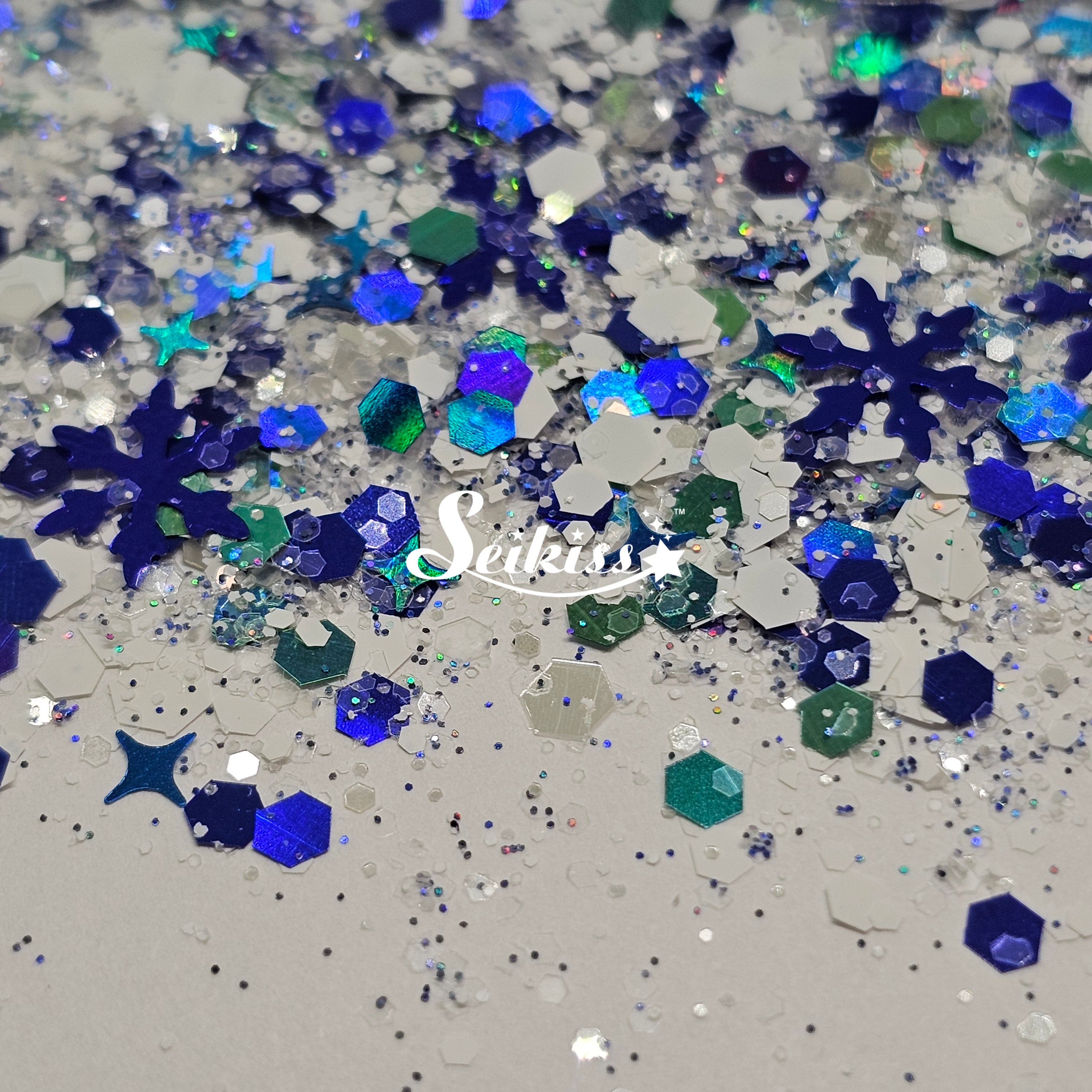 Winter in blue is a costume mix that features metallic white, holographic chunky mix of blue, turquoise, and frost white with blue snowflakes and turquoise shining stars adding a stunning visual effect to your artwork. This makes your projects shine and is perfect for resin, nails, tumblers, jewelry, arts, and all types of crafts and projects.
